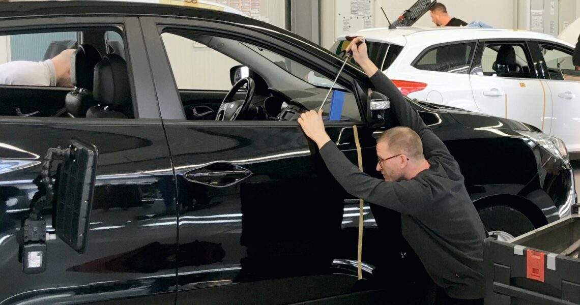 Beim Ausbeulen gibt es keine Universallösung, da jeder Schaden anders ist. Manchmal erfordert die Position der Delle sanfte Klebetechnik, in anderen Fällen ist die klassische Drücktechnik mit einem Hebel der bessere Weg. Wir bieten dir verschiedene Systeme an, damit du flexibel bleibst.