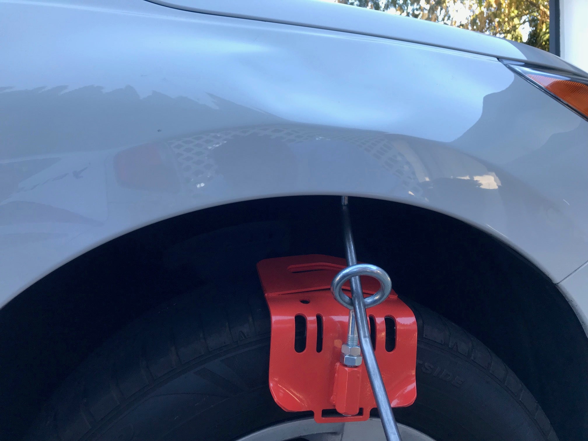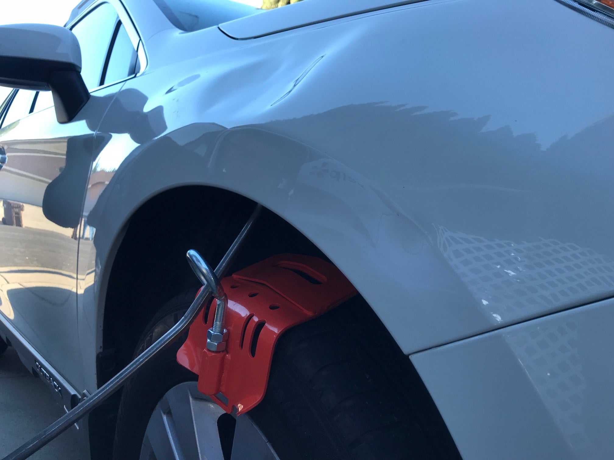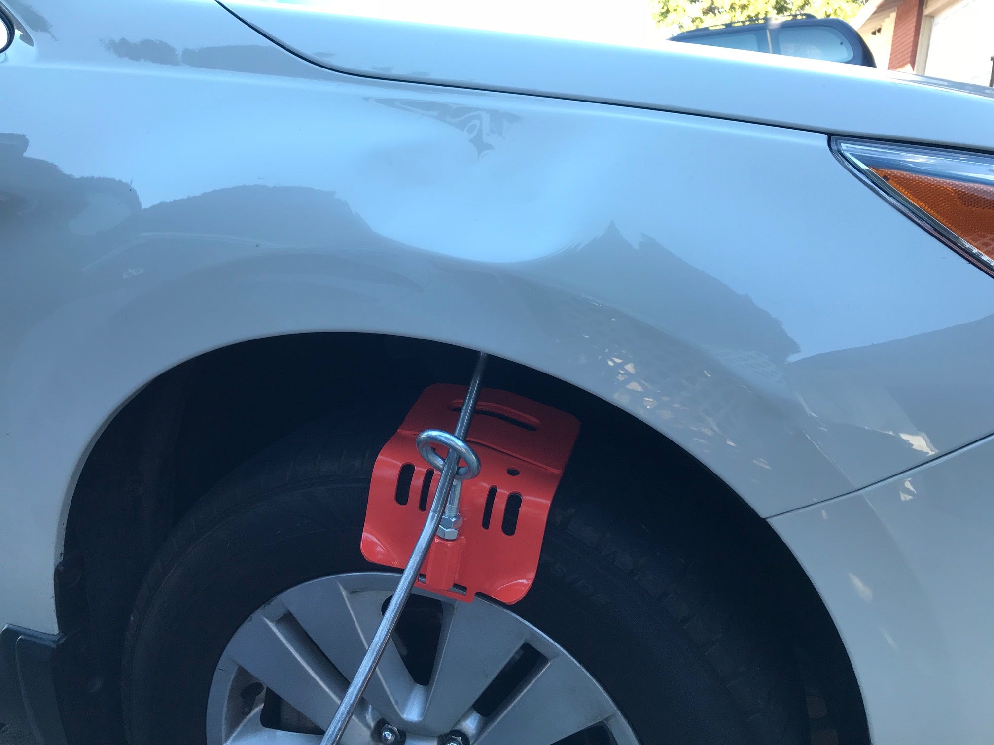 Fixierung eines Hebel- oder Ausbeulwerkzeugs im Bereich des Radlaufs, damit der Hebelpunkt optimal gesetzt werden kann und eine kontrollierte Kraftübertragung stattfindet.